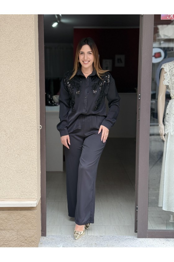 Pantalone vita alta con elastico sul retro. Vestibilità comoda. Il completo si riferisce al gilet e al pantalone