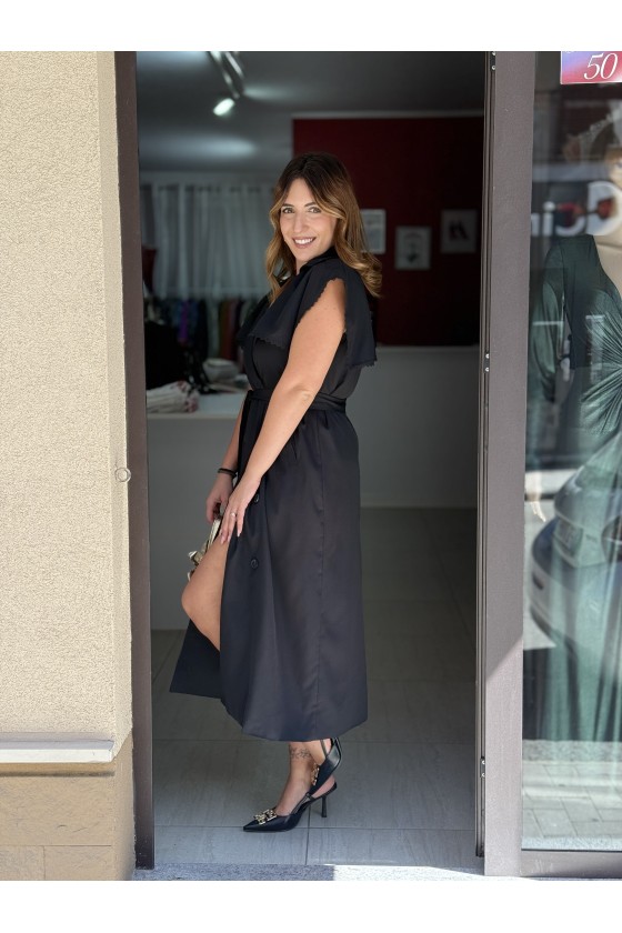 Pantalone con elastico in vita sul retro. Giacca strutturata, i bottoni sono a clip.