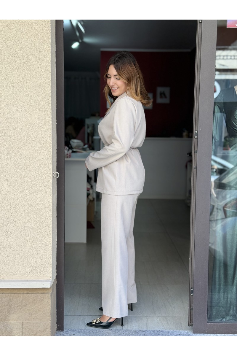 Pantalone vita alta con elastico in vita sul retro. Giacca con spalline.