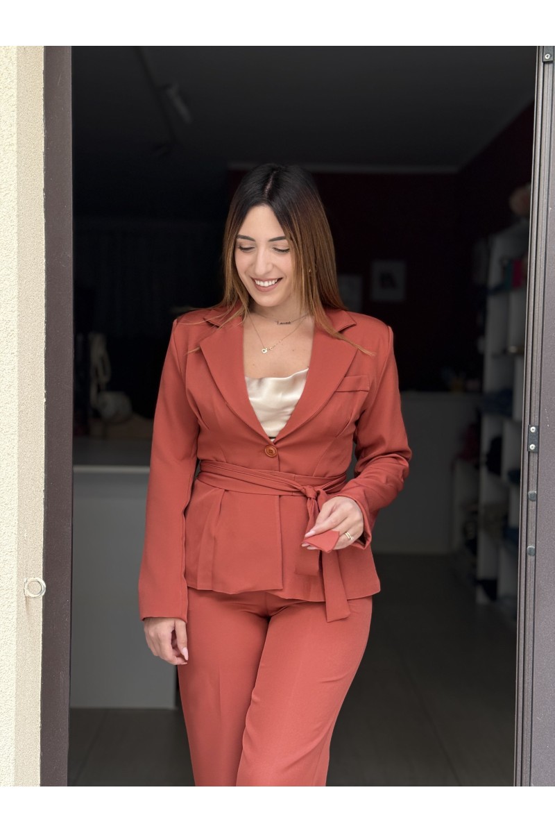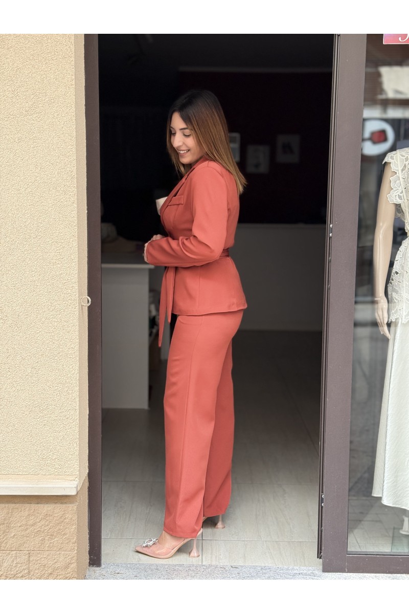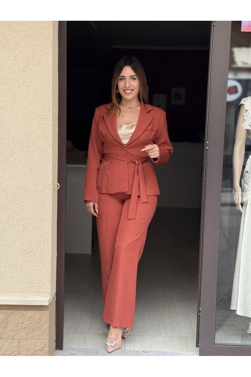 Pantalone vita alta con elastico in vita sul retro. Giacca con spalline, foderata.